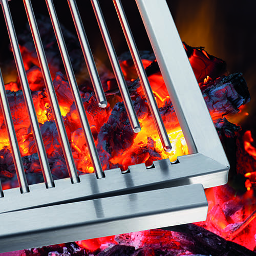 Grillrost mit herausnehmbaren Stäben zur leichten Reinigung. Mit 55 cm Breite und Länge bietet der Rost ausreichend Platz für einen ganzen Hauptgang mit Gemüse, Fleisch und Fisch für 10 bis 20 Personen