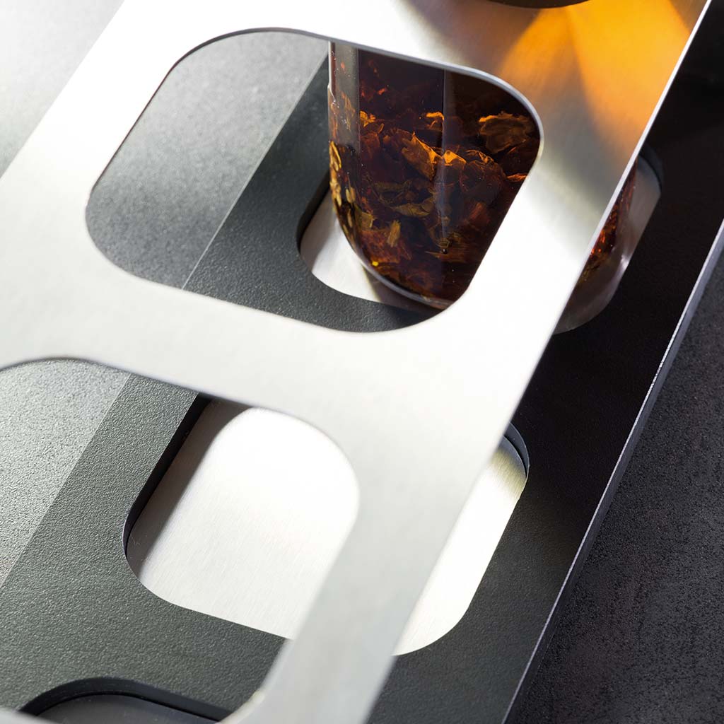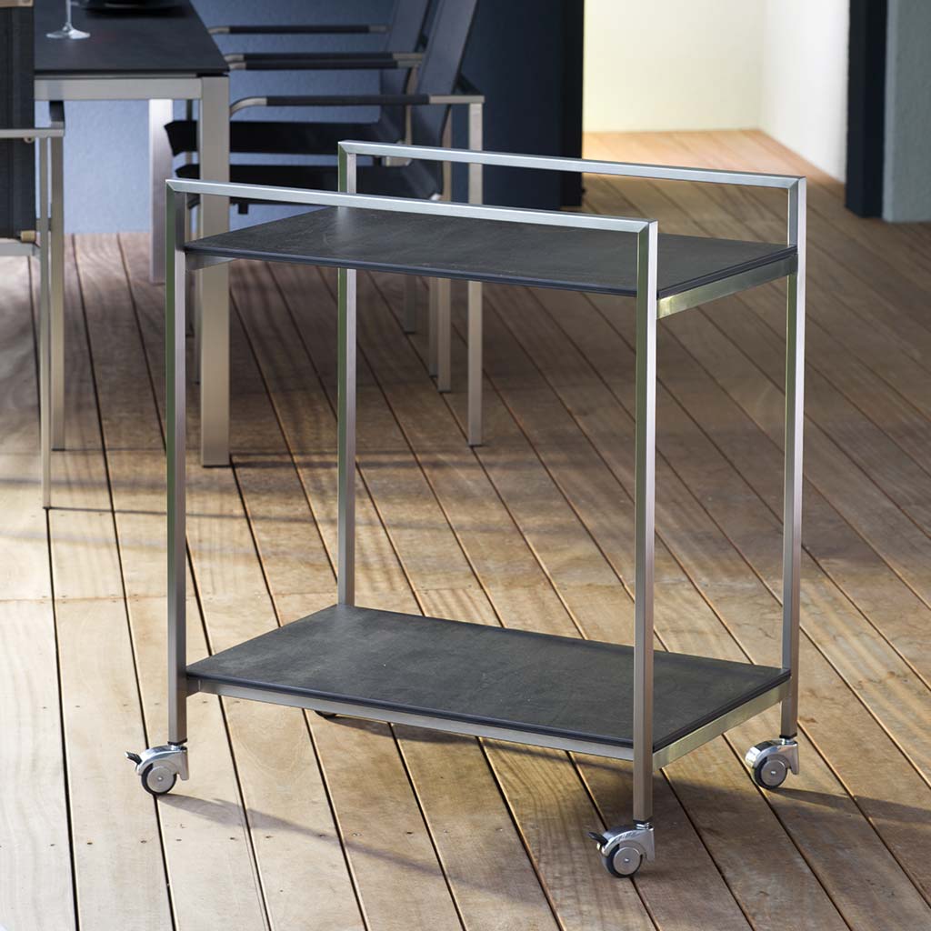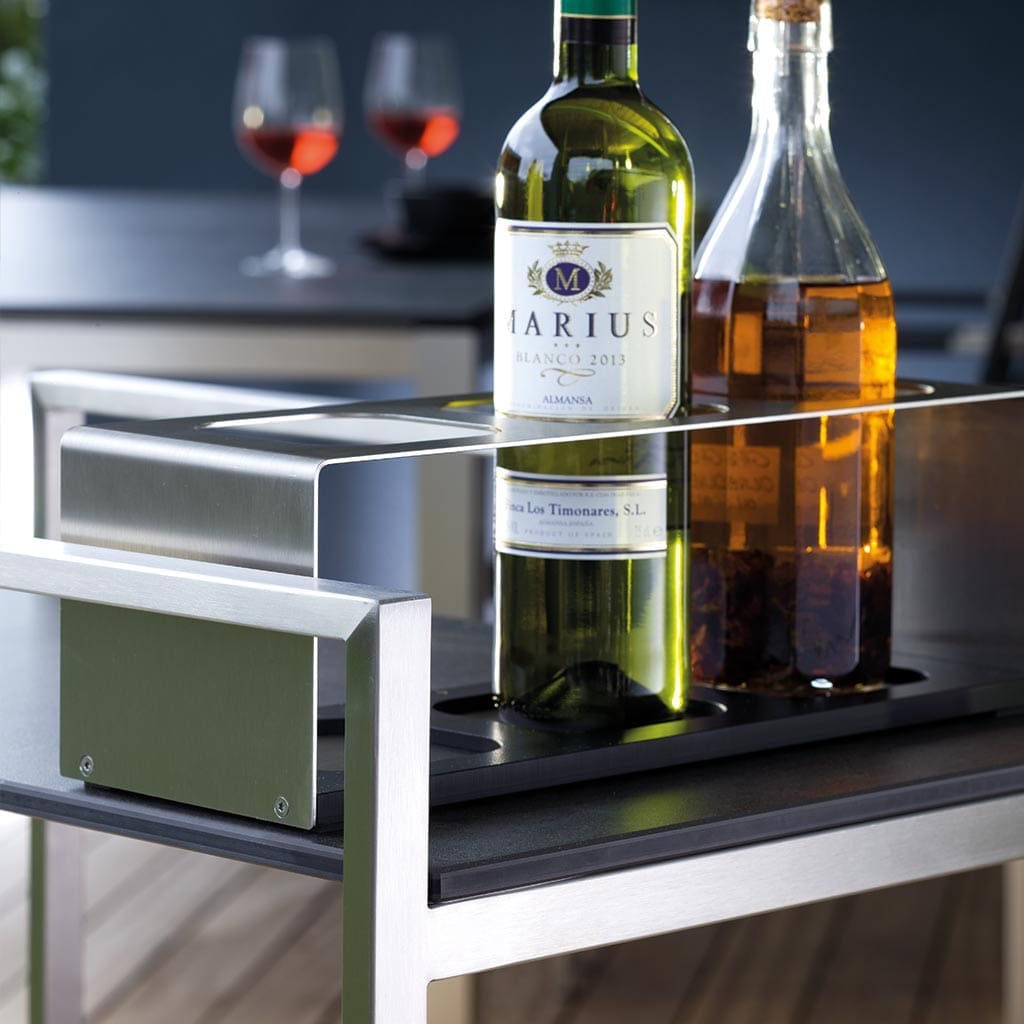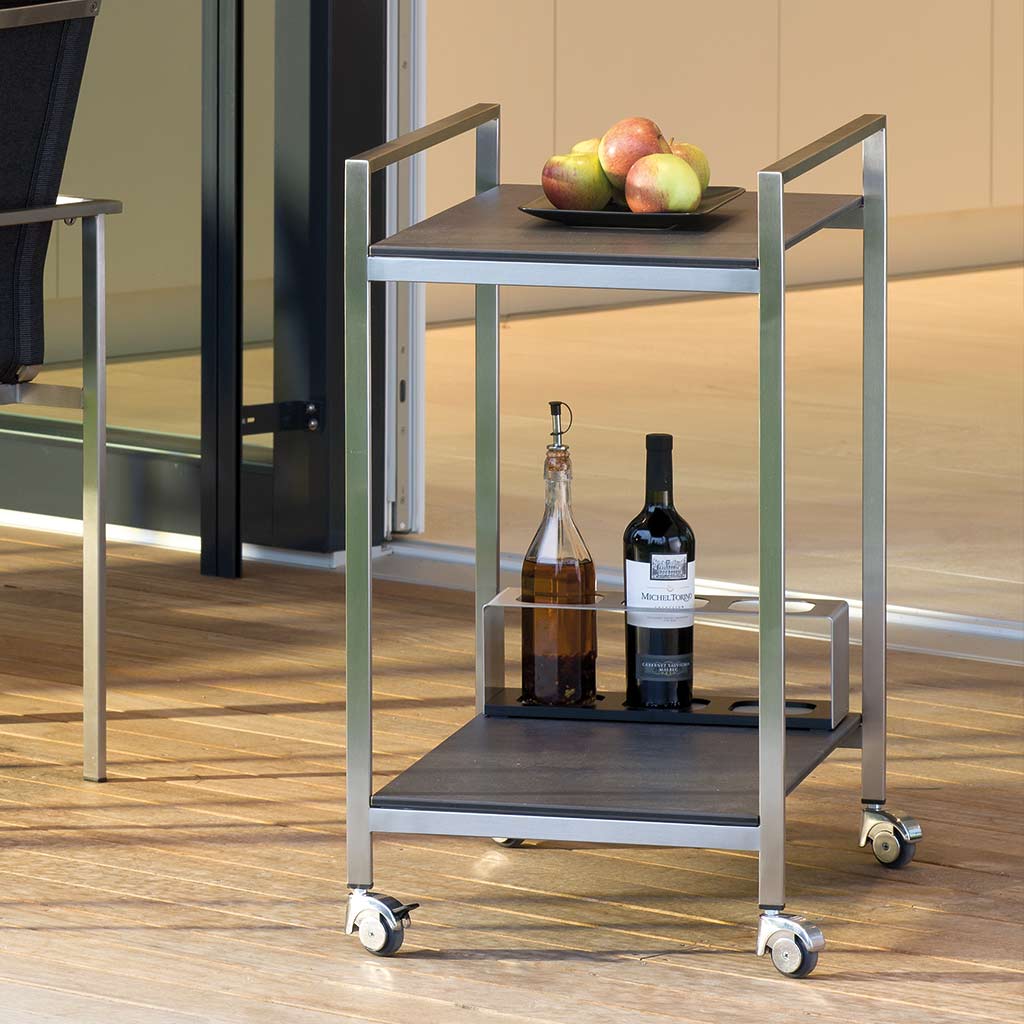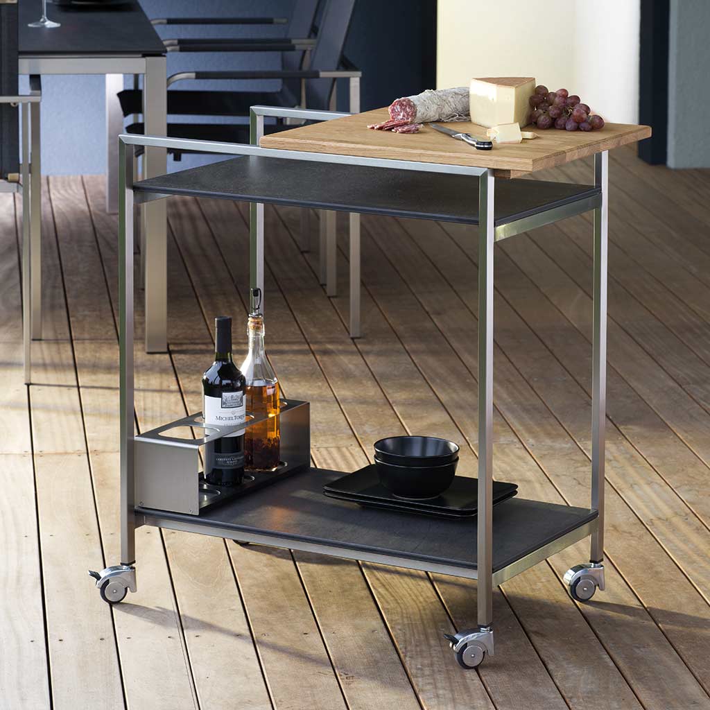 Der Servierwagen mit Feststellrollen passt hervorragend zu all unseren Tisch- und Stuhllinien und dient Ihnen nicht nur als mobile Abstell-, Präsentations- und Arbeitsfläche, sondern auch als praktisches Transportmittel. Eine Holzablage aus Eiche, die als Schneidebrett oder als Serviertablett eingesetzt werden kann, sowie ein passender Flaschenhalter runden das Konzept elegant ab.