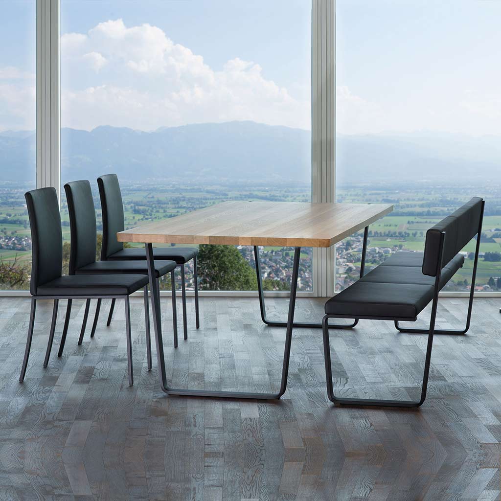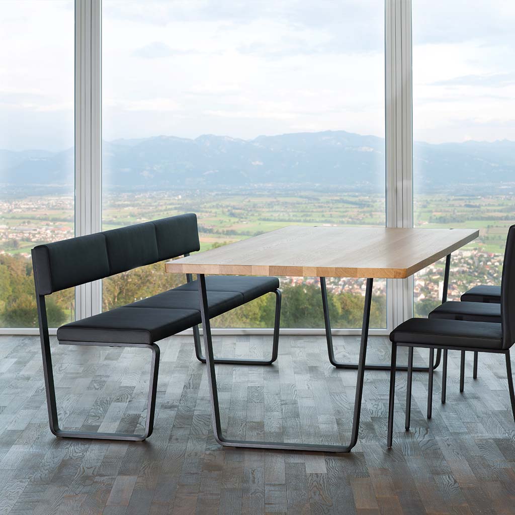 Die Tischfüsse sind nach innen versetzt und können in geschliffenem Edelstahl oder in pulverbeschichtet RAL gewählt werden. Die Kufe wirkt massiv und doch leicht. Eine Weltneuheit ist die Wohnbank MOMENTUM, die als Freischwinger konzipiert wurde. Die klare und dennoch weiche Optik passt sich geschmeidig den fliessenden Bewegungen des Tisches an und macht die beiden fast unzertrennlich.